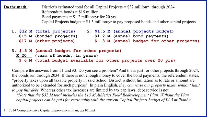 The biggest problem with the $15 million bonds is simple math. For the next 4 years, through 2018, there are $22.6 million in capital projects if you include the $13 million athletic fields plan. Through 2024, that number grows to over $32 million. The way it was sold to the board is they can have $15 million up front to knock off a bunch of projects and pay it back with $1.2 million/yr for 20 years out of their $1.5 million/yr budget, leaving $300,000/yr (for 20 yrs) to use for whatever comes up. Yet, over the bonds’ 20 yr payback, that $300,000/yr adds up to only $6 million (300,000 x 20=6,000,000). $15 million + $6 million = $21 million, $1.6 million short of the money needed just through 2018 for capital projects. But the bonds run through 2034! So for 16 YEARS, there will be no money for ANYTHING. When roofs leak and boilers fail, they won’t have the money to fix it, so what will they do? Raise taxes–but they will say it’s for the roofs, the boilers, the parking lots, the children. That $15 million they would have already spent included the unnecessary stuff: artificial turf, new stadium lighting, stands, maintenance shed, etc.
