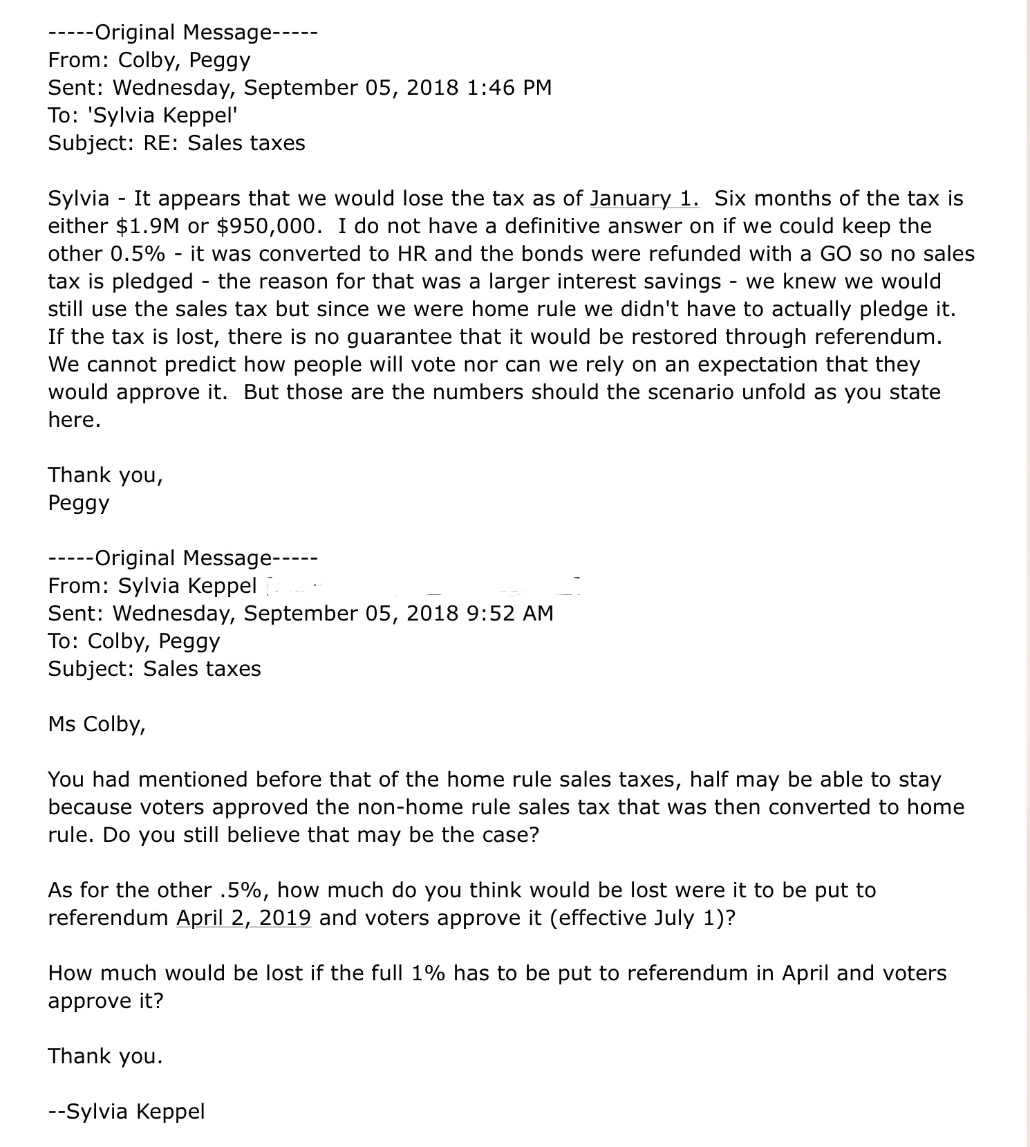 But why do I hear people saying the City will lose $3.3M-$5.2M/year without home rule? Those numbers are based on the assumption that the City will lose all of our home rule taxes and not make any effort to reinstate them by referendum or convert them to non-home rule taxes. The Mid-Year Finance Report on p. 15 says, “…$3.3M – $5.2M Annual Loss • Would be able to put referendum for NHR Sales Tax on future ballot”, but that last part very often gets ignored. If the City were to lose half (.5% instituted under home rule) or the whole (+.5% that had been approved by voters while non-home rule, but converted to home rule; total = 1%) of our home rule sales tax, and the sales tax were to be put to referendum April 2, 2019, with voter approval it would go into effect July 1. Based on that scenario, the Finance Director has replied in an email that the 6-month loss of revenue would be $950,000-$1.9 million (.5% or 1% sales tax). That represents a one-time loss if citizens decide they want to reinstate the sales tax. If the City can convince the people the money is needed, voters will vote for it, as they did for that first .5%. But with home rule right now, the City Council can increase sales and other taxes all they want, and citizens have no choice, no vote.